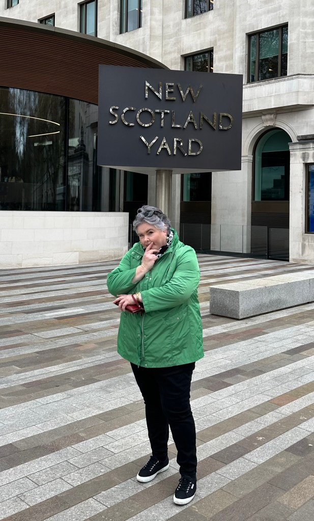 I think I’d make a great detective! I really had to pee, but when we walked up to the front of NSY it didn’t look very welcoming for a visit to the loo. Officers dressed in black, with kevlar vests and semi-automatic machine pistols guarded the doors. Now, this makes me think that I WANT to see what kind of fancy cludgie they are guarding. We pressed on. Sometimes I’m like a camel; I can hold forever if I know that in a while, we’ll be at a pub or whatever.